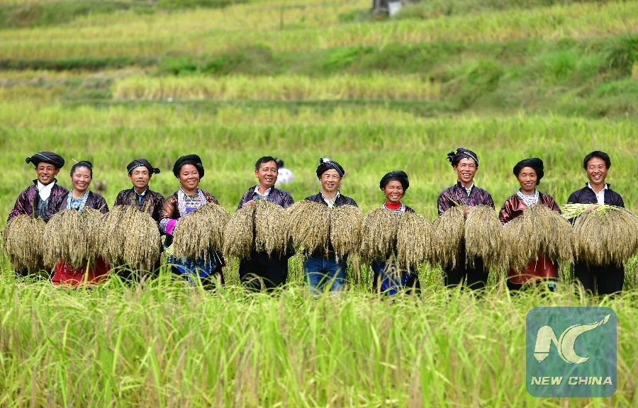 Farmers of the Miao ethnic group show harvested purple glutinous rice in Dali Village of Liangzhai Township in Rongshui Miao Autonomous County, south China's Guangxi Zhuang Autonomous Region, Oct. 12, 2018. Currently, there are about 1,000 mu (67 hectares) of purple glutinous rice fields in Dali Village with a crop yield of 200 kilograms per mu. A production mode that incorporates cooperatives, planting bases and individual farmers has helped the locals out of poverty. (Xinhua/Huang Xiaobang)