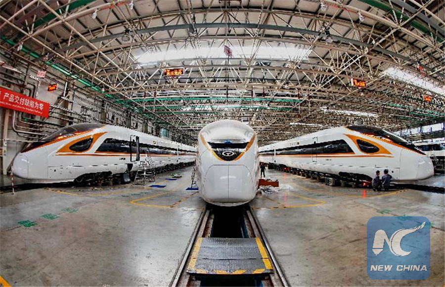 People work on an assembly line of the "Fuxing" bullet train set at Chinese company CRRC Tangshan Co., Ltd in Tangshan, north China's Hebei Province, on March 23, 2018. (Xinhua/Yang Shiyao)
