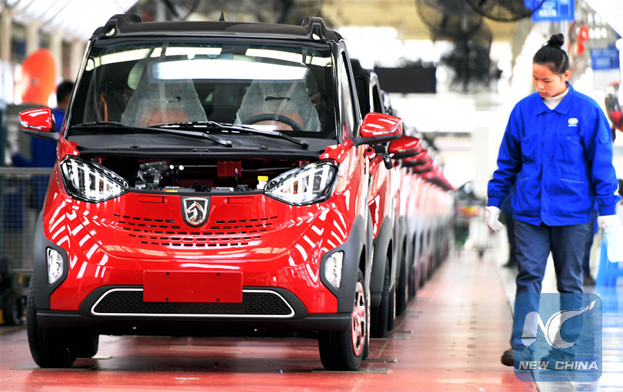 A worker checks the ready-to-off-line new energy automobiles at the SAIC-GM-Wuling Automobile Co. (SGMW) in Liuzhou, south China's Guangxi Zhuang Autonomous Region, on Jan. 23, 2018.(Xinhua/Zhang Ailin)