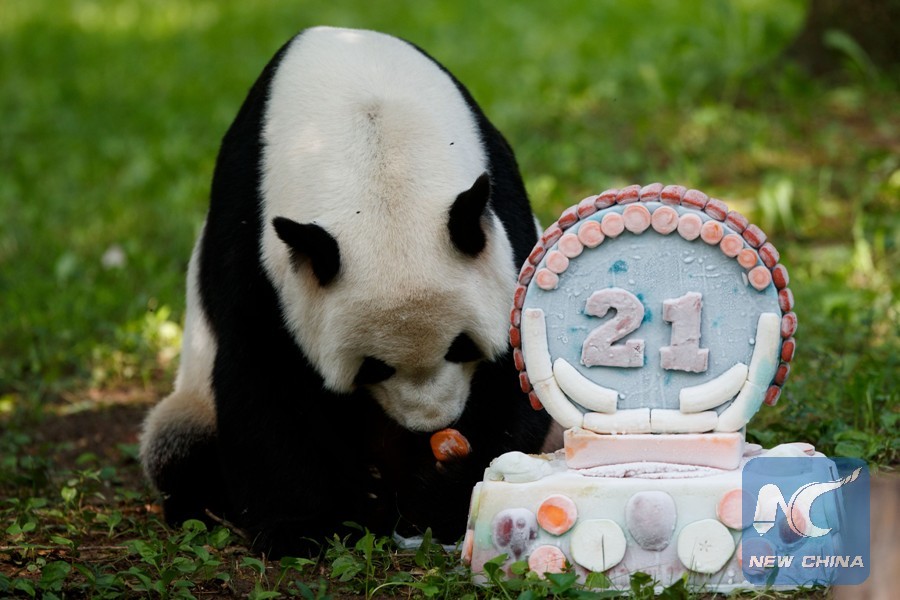 File Photo: Giant panda Tian Tian enjoys its birthday cake at the Smithsonian's National Zoo in Washington D.C., the United States, on Aug. 27, 2018. (Xinhua/Ting Shen)