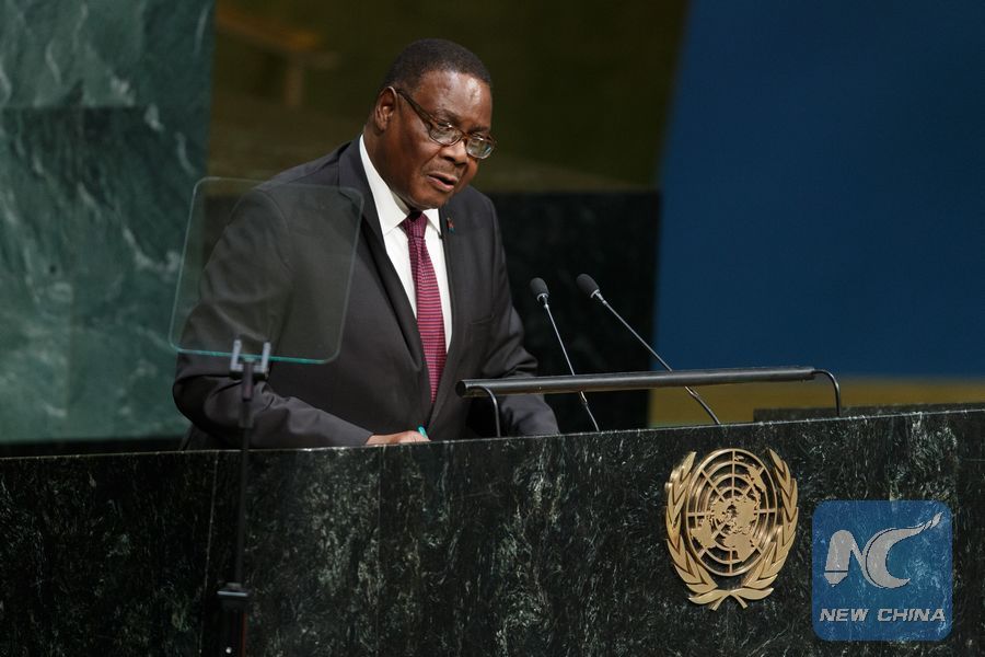 File photo shows Malawi's President Arthur Peter Mutharika addresses the Sustainable Development Summit at the UN headquarters in New York, Sept. 25, 2015. (Xinhua/Li Muzi)