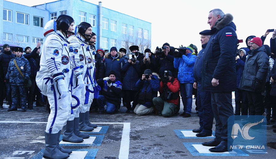 NASA astronaut Anne McClain, Russian cosmonaut Oleg Kononenko and David Saint-Jacques of the Canadian Space Agency report to Dmitry Rogozin, head of the Russian space agency Roscosmos, prior to the launch onboard the Soyuz MS-11 spacecraft at the Baikonur cosmodrome in Kazakhstan on Dec. 3, 2018.