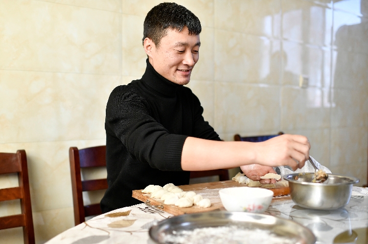 Railway policeman Gou Fawei makes dumplings for his wife, policewoman Luo Yakun, at the police station of the Liwang Railway Station in Haiyuan County, northwest China's Ningxia Hui Autonomous Region, Jan. 23, 2019. (Xinhua/Wang Peng)
