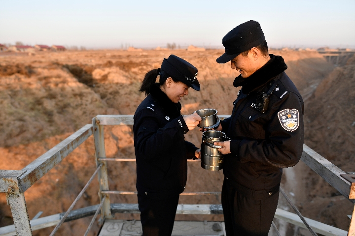 Railway policeman Gou Fawei (R) brings dumplings to his wife, policewoman Luo Yakun, on a railway bridge on the junction of the administrative areas by their two police stations when they patrol the railway line crossing Haiyuan County and its neighboring Tongxin County in northwest China's Ningxia Hui Autonomous Region, Jan. 23, 2019. (Xinhua/Wang Peng)