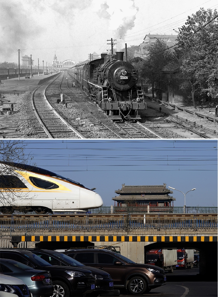 This combo photo shows the first Beijing-Guangzhou direct train leaving the Beijing Railway Station on Oct. 14, 1957 (top, photo taken by Meng Qingbiao); and a Fuxing bullet train passing by the Yongdingmen gate tower as it travels on the Beijing-Tianjin intercity rail, Jan. 25, 2019 (bottom, photo taken by Xing Guangli).