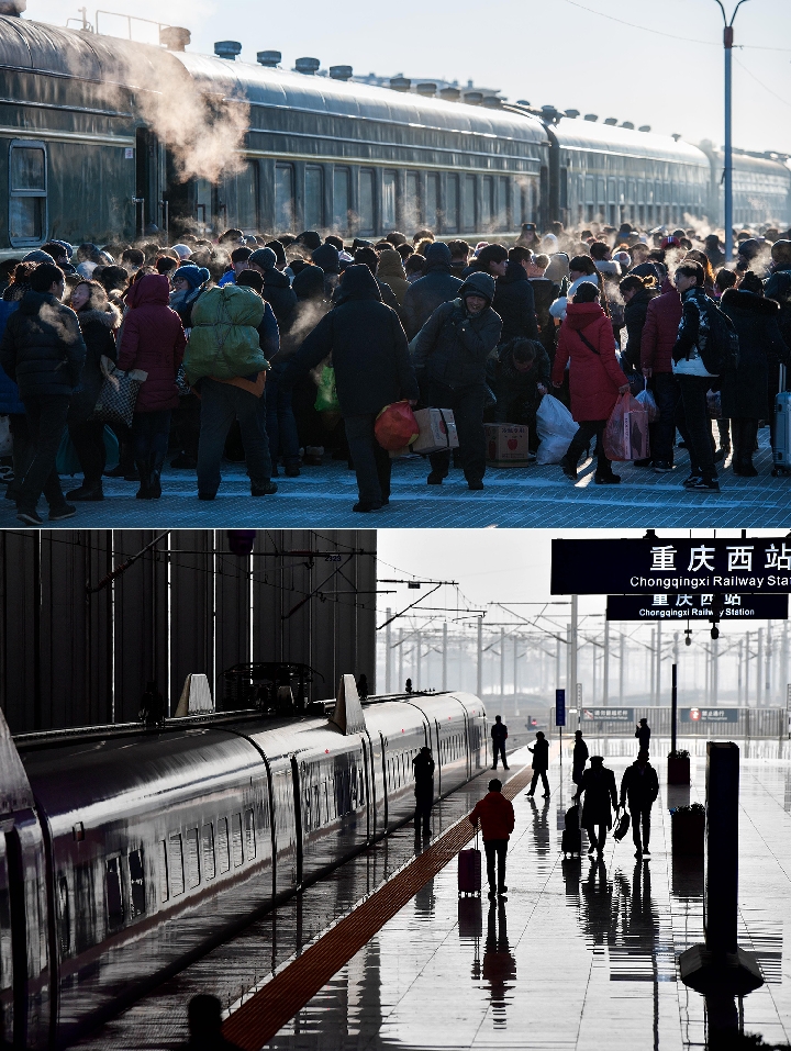 This combo photo shows passengers boarding an old-style green train on a platform at the Genhe Railway Station in Hulun Buir, north China's Inner Mongolia Autonomous Region, on Jan. 31, 2016 (top, photo taken by Lian Zhen); and a bullet train which is about to depart from Chongqing West Station in southwest China's Chongqing, Feb. 12, 2018 (bottom, photo taken by Liu Chan).