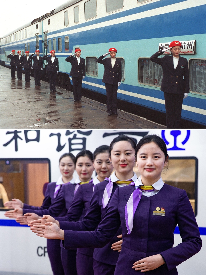 This combo photo shows attendants getting ready to work aboard the train K1/6 during the Spring Festival travel rush in Nanjing, east China's Jiangsu Province in January of 1998 (top, photo taken by Gao Meiji); and bullet train stewards taking part in an etiquette training in Nanjing, east China's Jiangsu Province, Jan. 17, 2019 (bottom, photo taken by Su Yang).