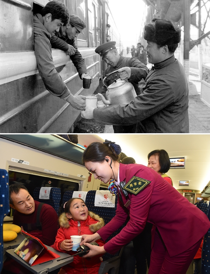 This combo photo shows station staff members offering hot water for train passengers at the Shijiazhuang Railway Station during the Spring Festival travel season in Shijiazhuang, north China's Hebei Province in 1984 (top, photo taken by Zhao Liansheng); and train attendant Liao Hui of the Nanchang Railway Bureau offering a cup of water for a young passenger on Feb. 6, 2016 (bottom, photo taken by Jiang Kehong).