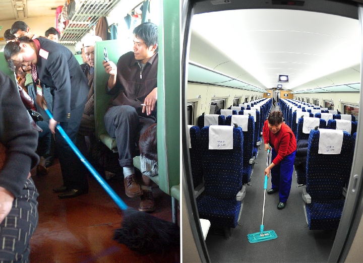 This combo photo shows a train attendant mopping in a train carriage that travels from Urumqi to Kashgar in northwest China's Xinjiang Uygur Autonomous Region, March 10, 2005 (left, photo taken by Sadat); and a worker cleaning a bullet train carriage at a depot in Wuhan, central China's Hubei Province, early on Feb. 10, 2011 (right, photo taken by Cheng Min).