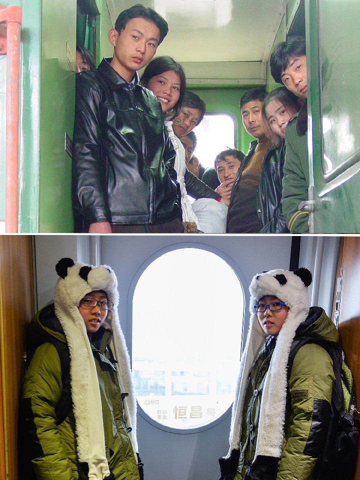 This combo photo shows passengers without seats looking out of a train traveling from Shanghai to Fuyang, as the train pulls into the Nanjing Railway Station in Nanjing, east China's Jiangsu Province, Jan. 7, 2004 (top, file photo); and twin brothers Liu Hong (L) and Liu Xiang standing next to the door of the train G118 while travelling from Rizhao, east China's Shandong Province to Beijing, capital of China, Jan. 24, 2016 (bottom, photo taken by Li Xiang).