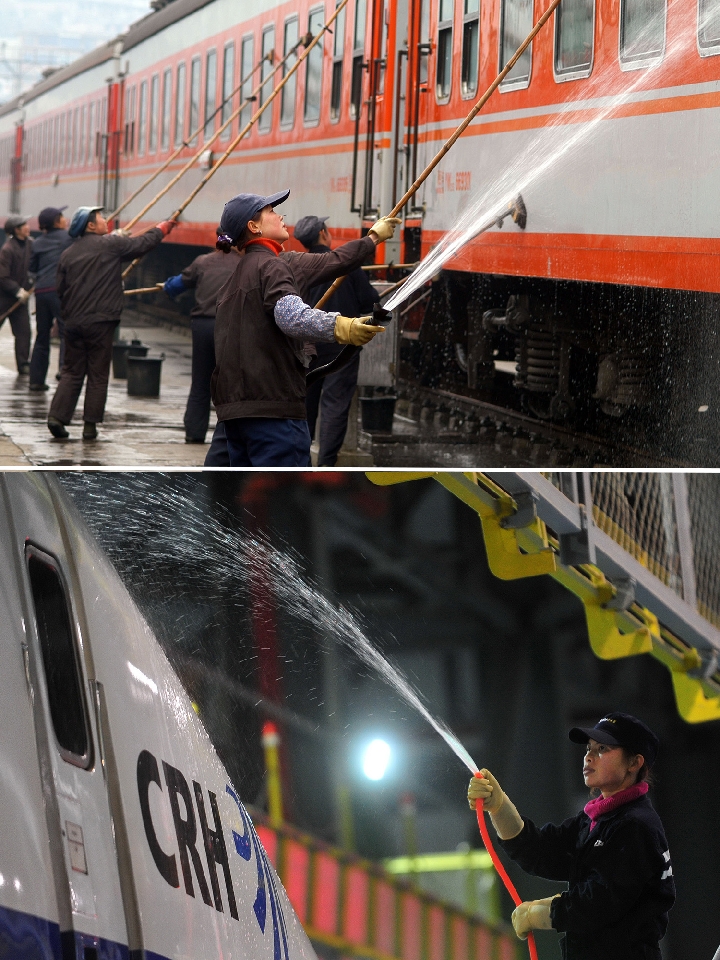 This combo photo shows cleaners washing a train at the end of the Spring Festival travel season at the Guiyang Railway Station in Guiyang, southwest China's Guizhou Province, March 5, 2005 (top, photo taken by Wu Dongjun); and a cleaner washing a bullet train at a depot in Wuhan, central China's Hubei Province, early on Feb. 10, 2011 (bottom, photo taken by Cheng Min).