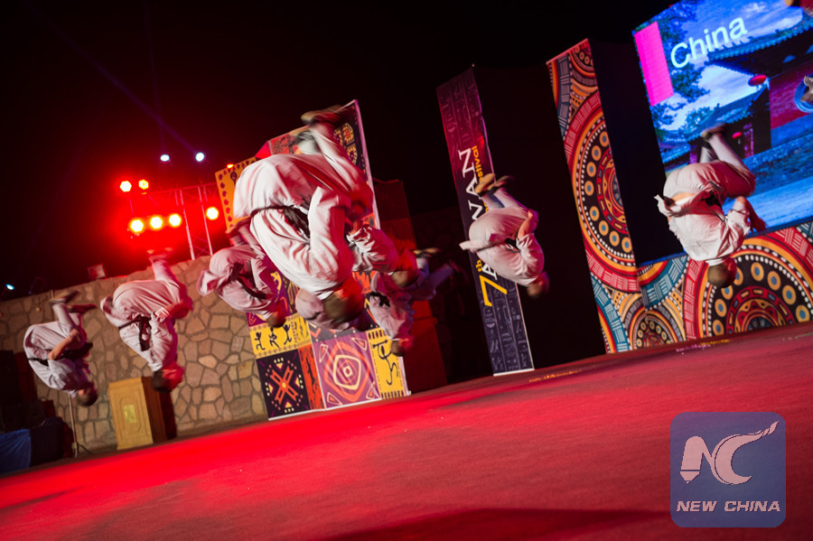 Monks of the Chinese Shaolin Kung Fu group perform at the opening ceremony of Aswan International Festival of Culture and Arts in Aswan, Egypt, Feb. 17, 2019. (Xinhua/Meng Tao)