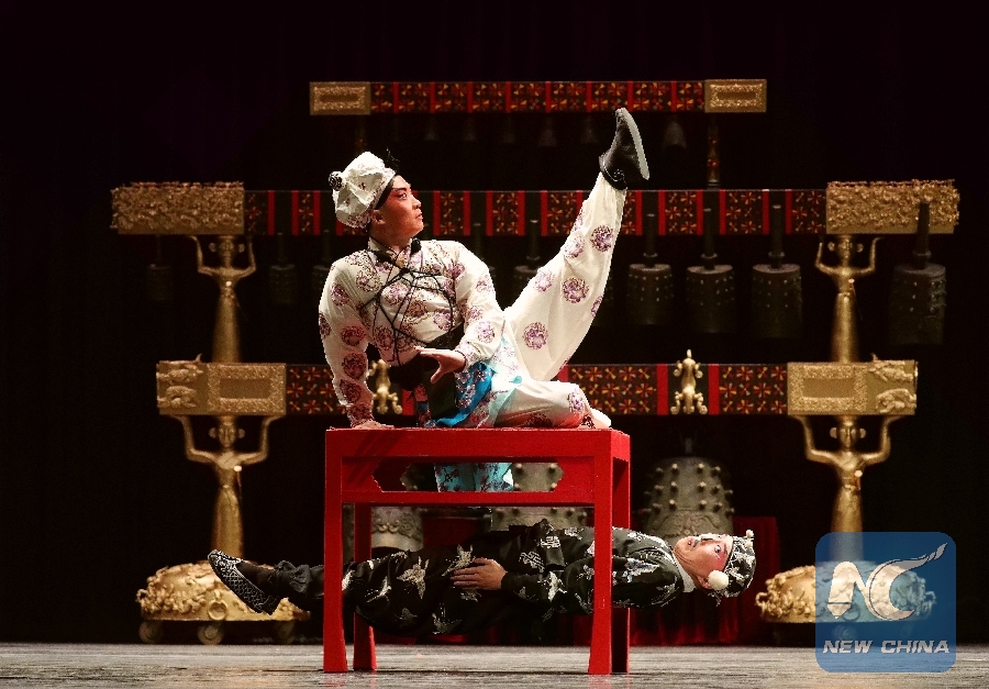 Members of the China National Peking Opera Company perform at the auditorium of the Central Middle School in Muscatine, the United States, Feb. 14, 2019. The performance delighted the local audience, marking the fourth consecutive year for Muscatine to hold such a Chinese Lunar New Year concert. (Xinhua/Wang Ping)