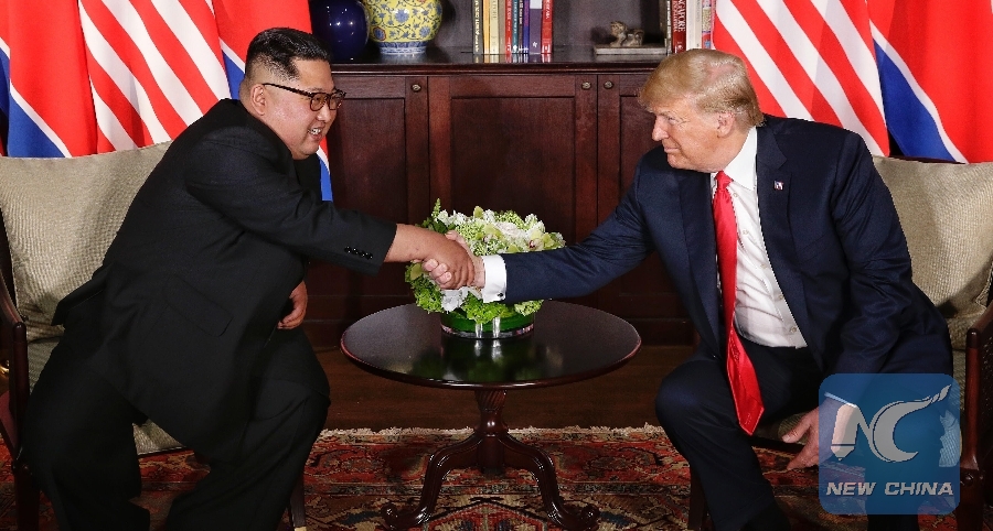 File Photo: Top leader of the Democratic People's Republic of Korea (DPRK) Kim Jong Un (L) meets with U.S. President Donald Trump in Singapore, on June 12, 2018. (Xinhua/Ministry of Communication and Information of Singapore)