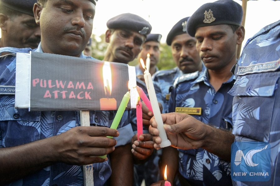 Indian Central Reserve Police Force (CRPF) personnel hold candles and pay tribute to their colleagues in Hyderabad on Feb. 15, 2019, the day after an attack on a paramilitary Central Reserve Police Force (CRPF) convoy in the Lethpora area of Kashmir. (Xinhua/AFP)