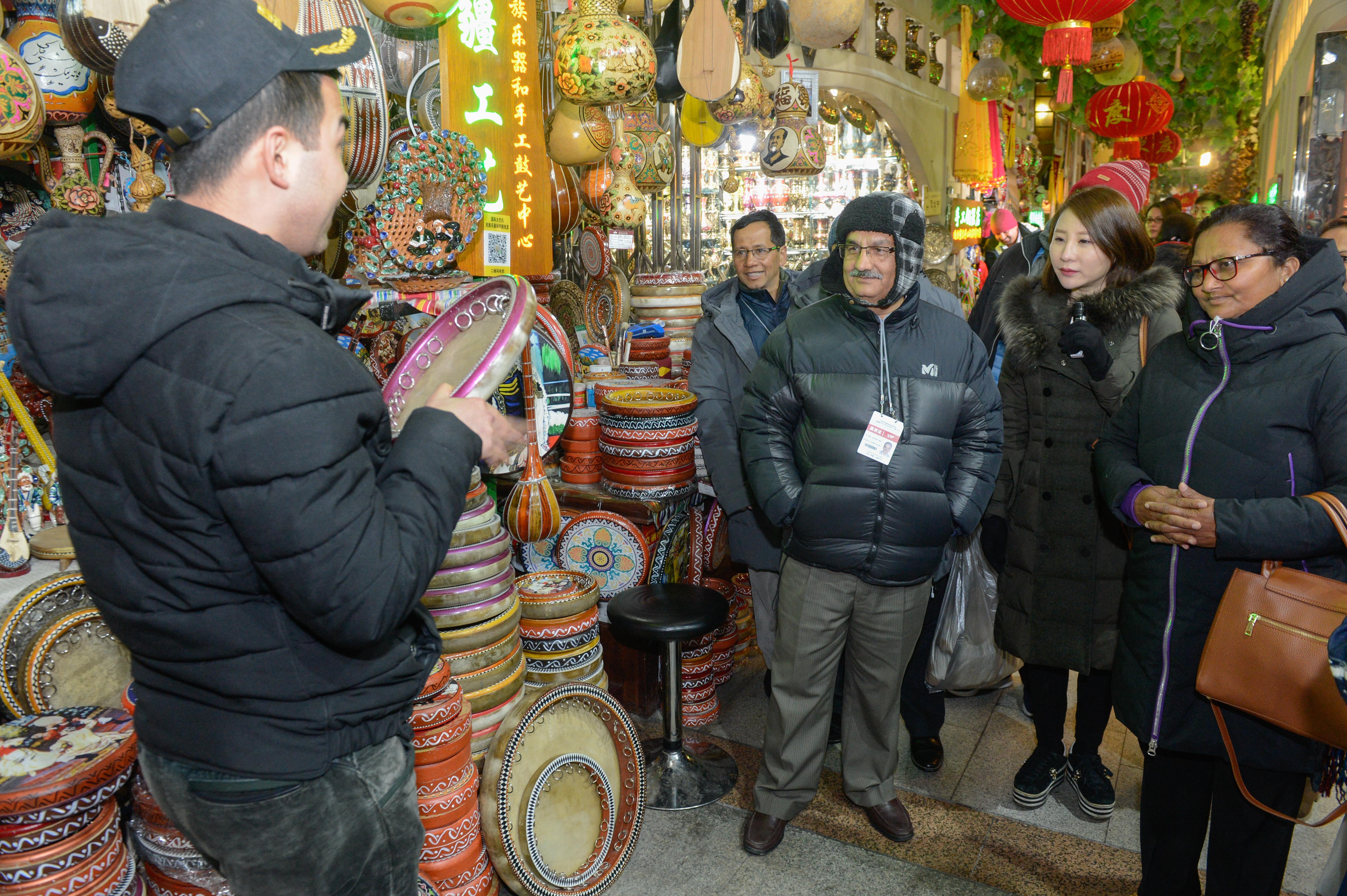 Representatives of foreign political parties visit the grand bazaar in Urumqi, the capital city of northwest China's Xinjiang Uygur Autonomous Region. Feb. 27, 2019. (Xinhua/Ding Lei)
