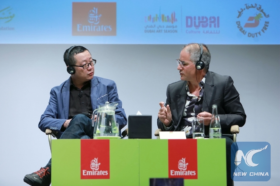 Chinese sci-fi writer Liu Cixin (L) speaks during a meeting with his readers at the Emirates Airline Festival of Literature in Dubai, the United Arab Emirates (UAE), on March 8, 2019. (Xinhua)