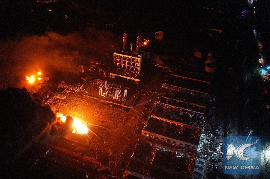 Aerial photo taken on March 21, 2019 shows the scene of an industrial park after an explosion in the city of Yancheng, east China's Jiangsu Province. (Xinhua/Ji Chunpeng)