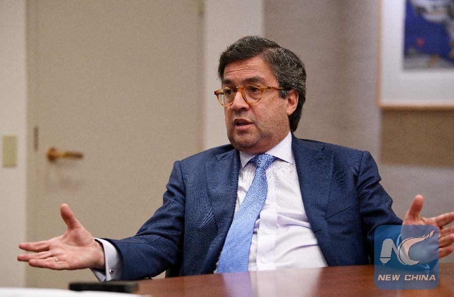 Luis Alberto Moreno, president of the Inter-American Development Bank (IDB), receives an interview with Xinhua at the headquarters of the IDB in Washington D.C., the United States, April 23, 2019. (Xinhua/Liu Jie)