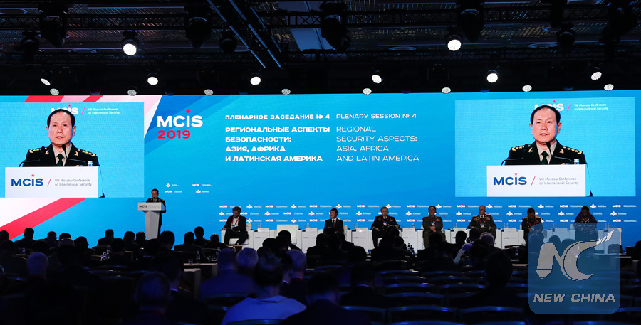 Chinese State Councilor and Minister of National Defense Wei Fenghe speaks at the eighth Moscow Conference on International Security in Moscow, Russia on April 25, 2019. (Xinhua/Li Xiaowei)