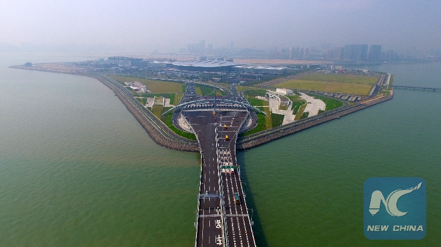 Aerial photo taken on Oct. 24, 2018 shows cars running on the Hong Kong-Zhuhai-Macao Bridge. (Xinhua/Liang Xu)