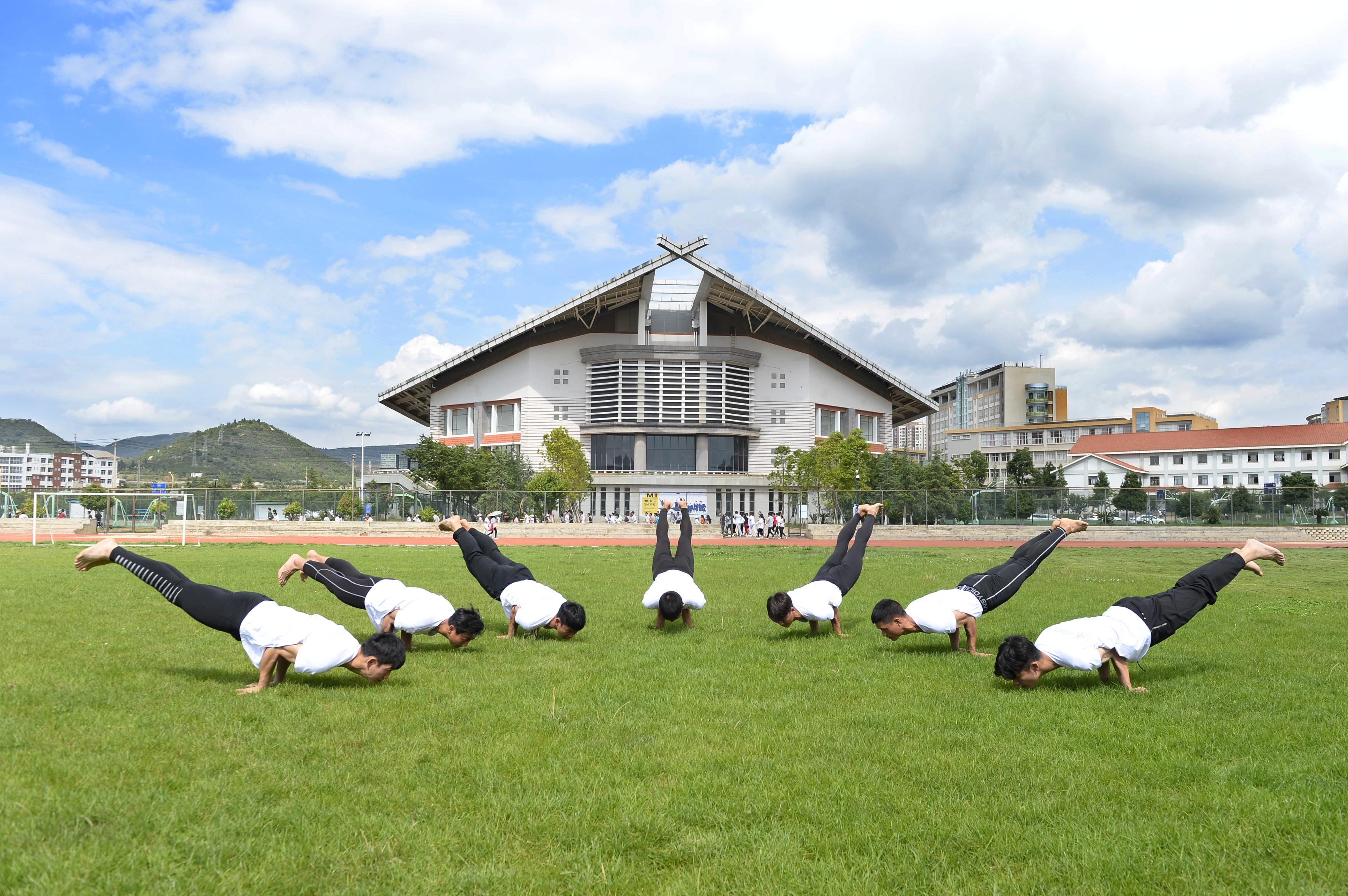 Freshmen of the India-China Yoga College of Yunnan Minzu University practise yoga in Kunming, southwest China's Yunnan Province, June 21, 2018. (Xinhua/Xie Ziyi)