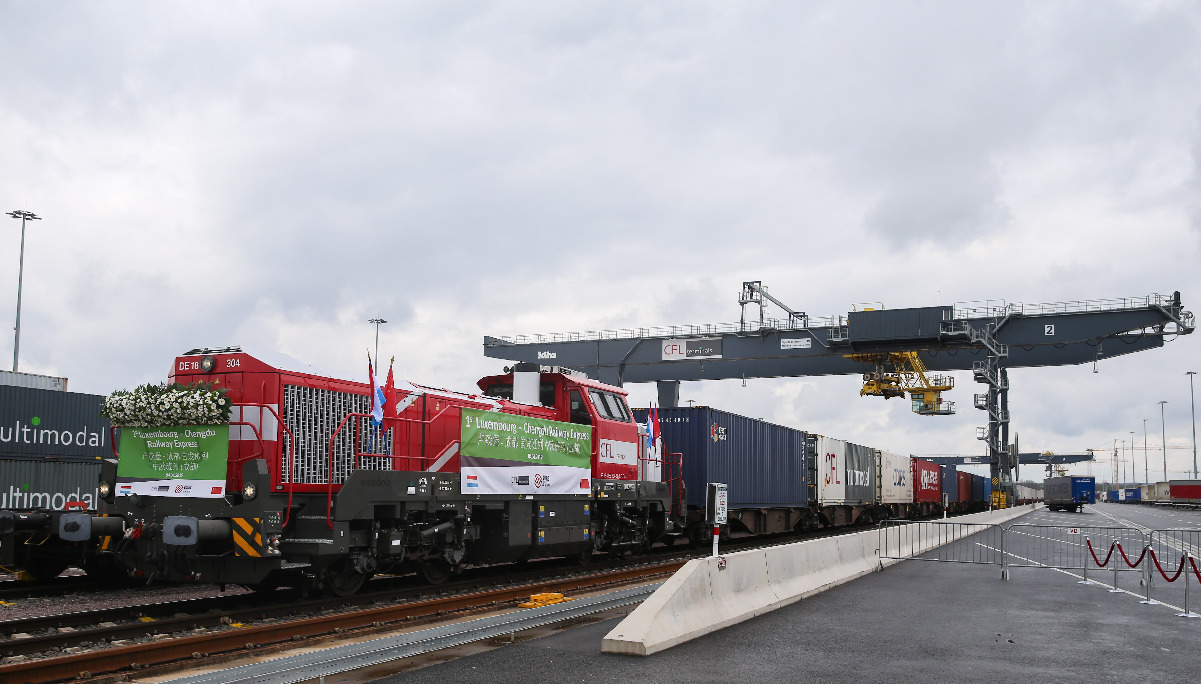 The first Luxembourg-Chengdu freight train is seen before start at a cargo train station in Dudelange, Luxembourg, April 4, 2019. (Xinhua)