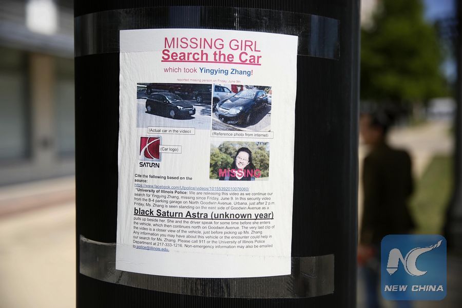 File photo taken on July 1, 2017 shows a poster about Yingying Zhang in the place where she was kidnapped by the suspect in Champaign, Illinois, the United States. (Xinhua/Wang Ping)