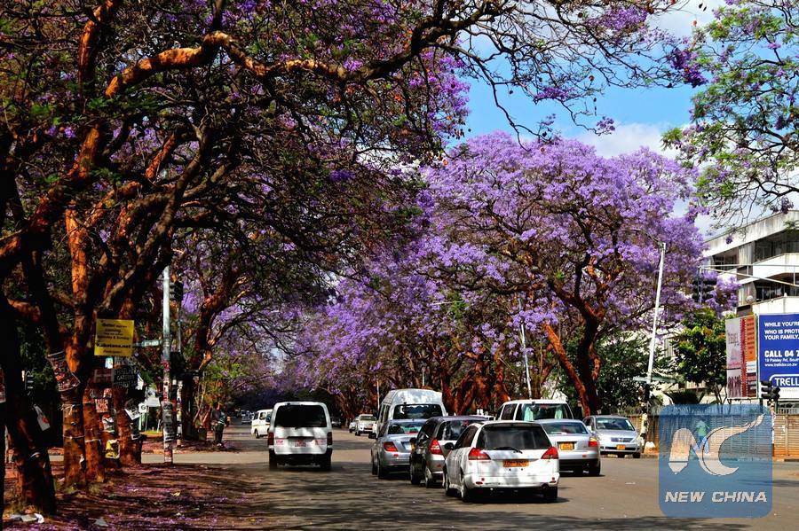 File photo shows a beautiful scene in the Zimbabwean capital Harare during a season of blooming jacaranda flowers. (Xinhua/Wang Yue)