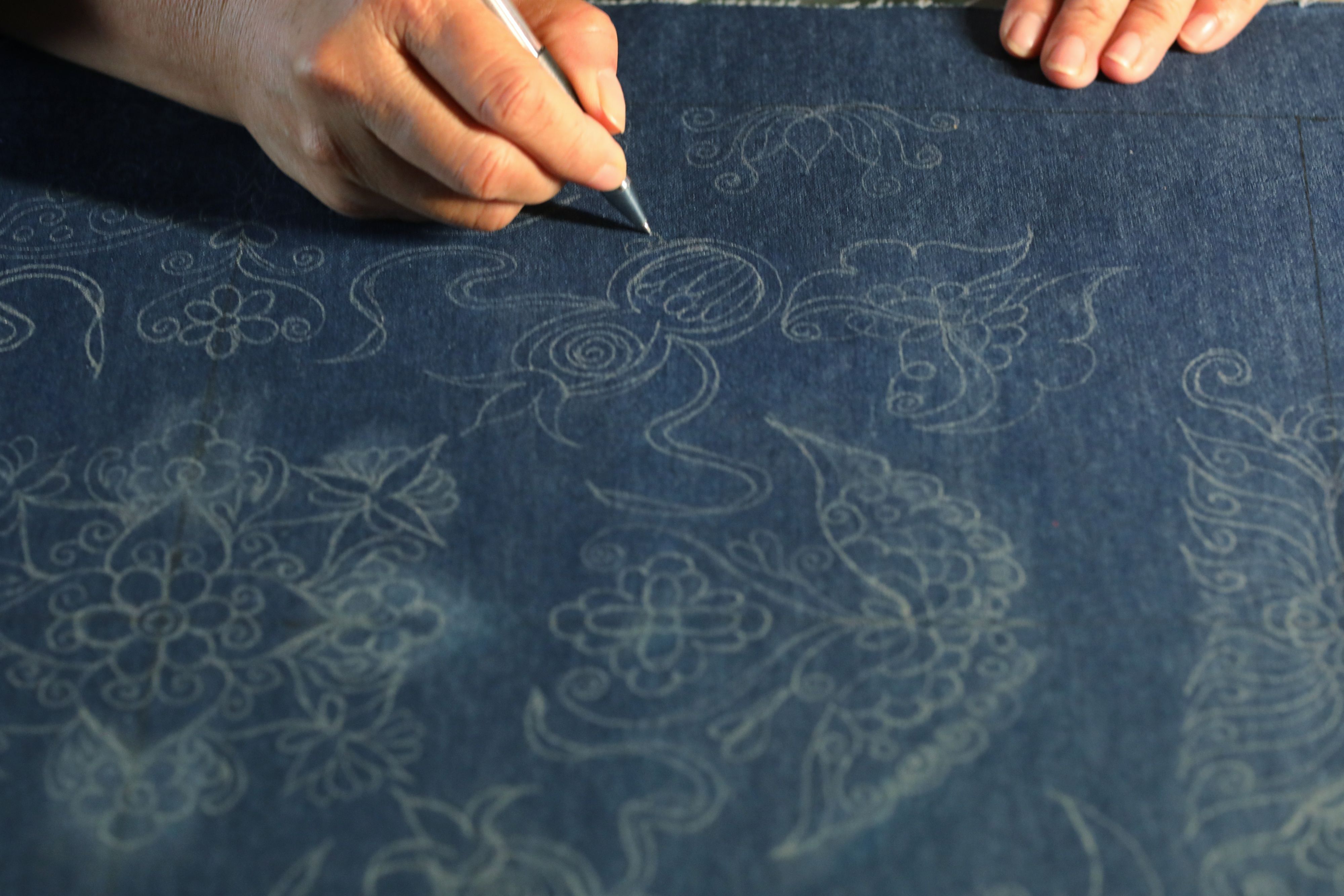 Wei Taohua, an embroiderer of the Shui ethnic group, draws needlework sketches for the traditional horse tail embroidery in Sandu Shui Autonomous County, southwest China's Guizhou Province, July 6, 2019. (Xinhua/Ou Dongqu)