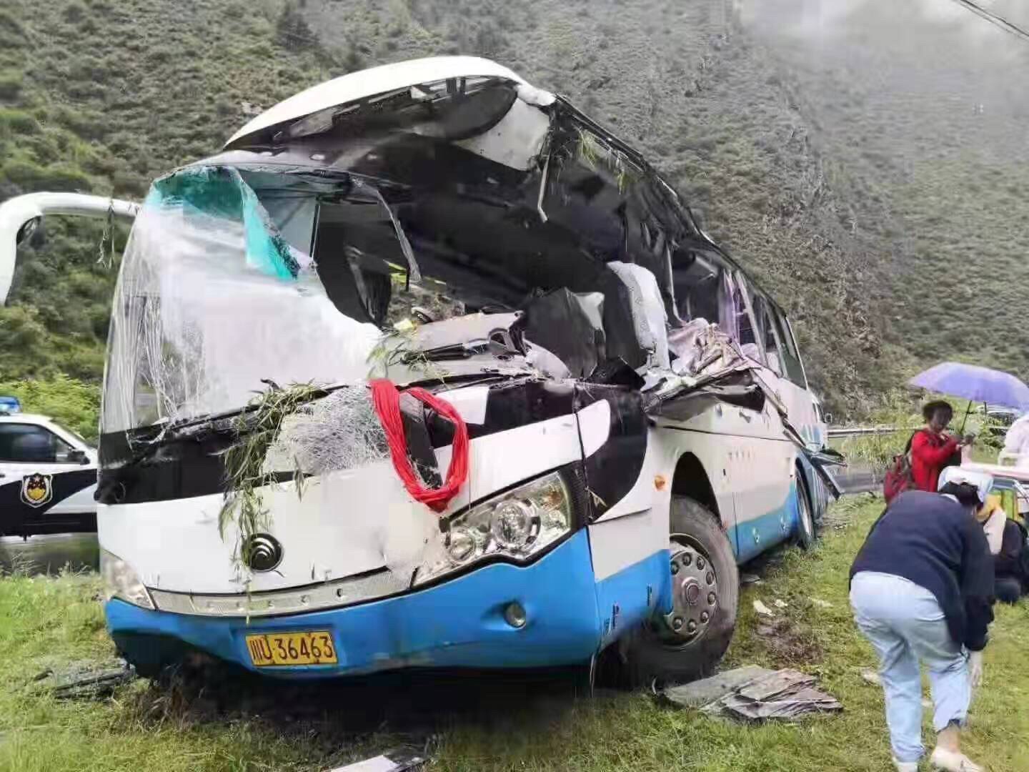 The accident happened around 2:05 p.m. on a road in the county of Songpan in Aba Tibetan and Qiang Autonomous Prefecture. The bus, carrying 30 people, slipped to the roadside grass after being hit.