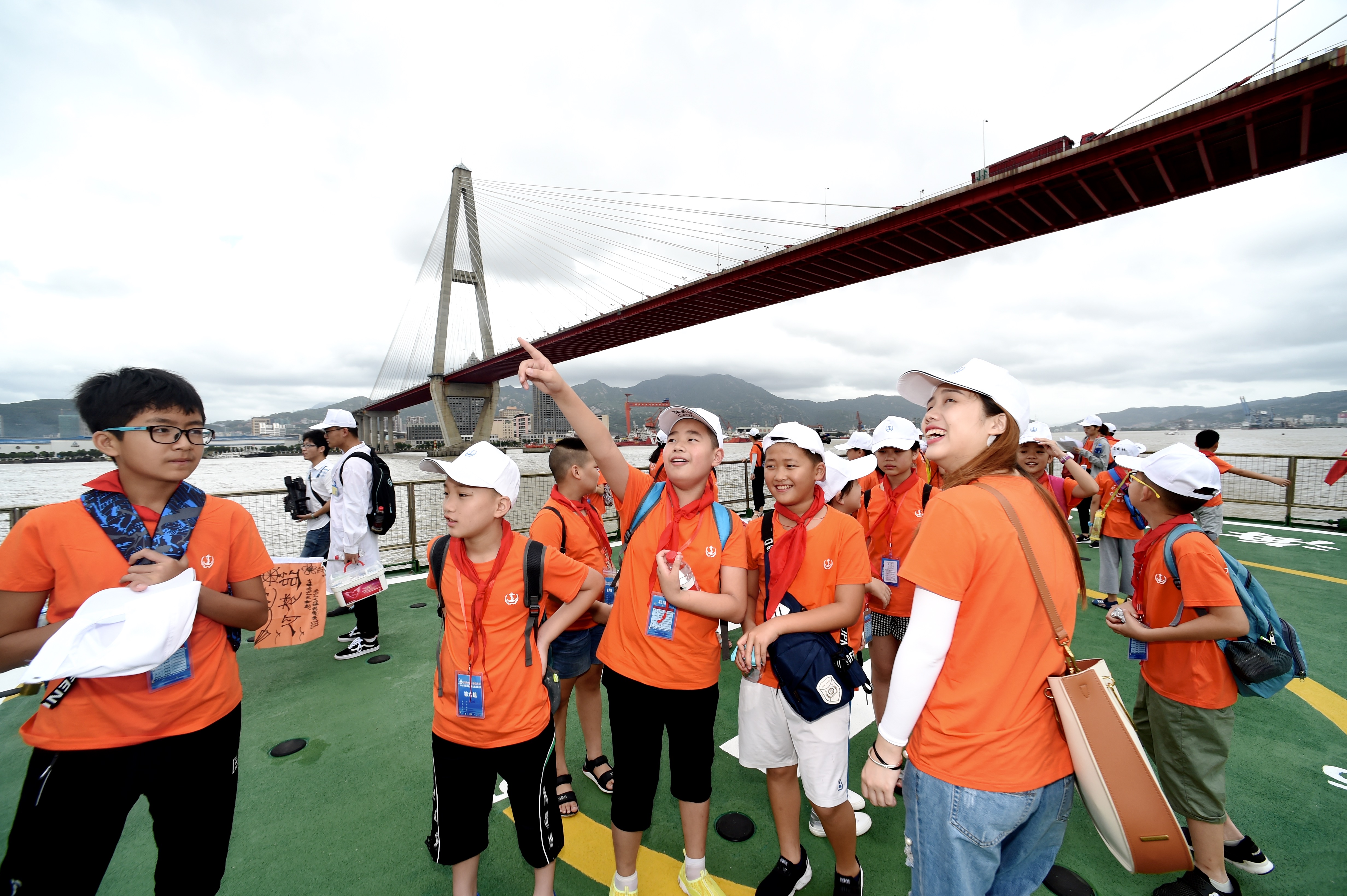 Children take boat on the Majiang waters of Minjiang River Estuary during their sailing camp in Fuzhou, capital of southeast China's Fujian Province, July 14, 2018. (Xinhua)