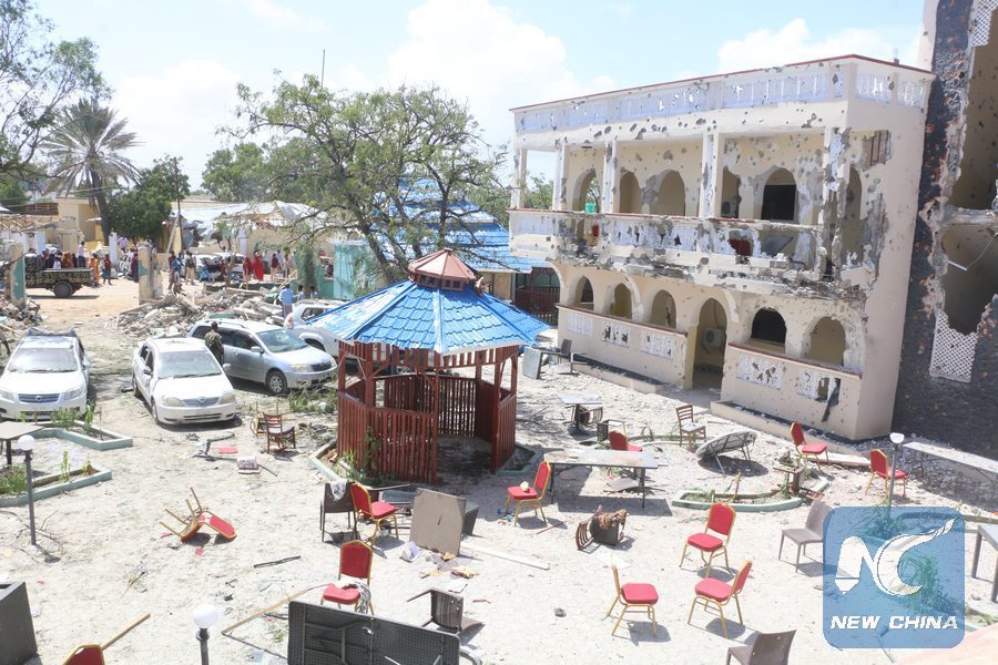 Destructed materials scatter Medina hotel in the southern port town of Kismayo after Al-Shabab militants attacked the hotel, killing more than 26 and wounding 56 others. (Xinhua)