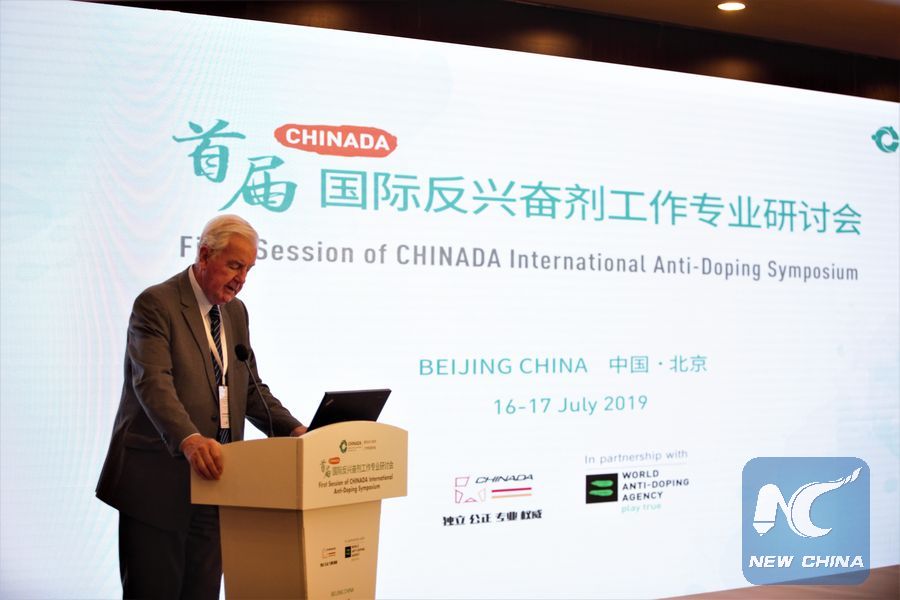 World Anti-Doping Agency president Craig Reedie delivers a speech at an international anti-doping symposium hosted by the China Anti-Doping Agency in Beijing on July 16. (Xinhua/Zhang Xu)