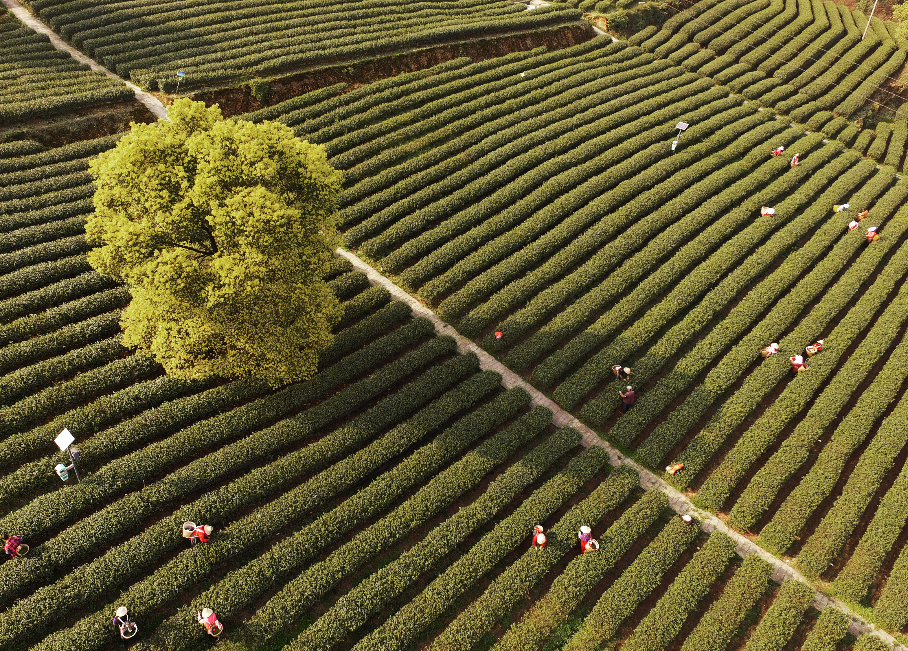 Aerial photo shows people picking spring tea at Baixiang Mountain in southwest China's Chongqing, March 18, 2019.(Xinhua/Wang Quanchao)