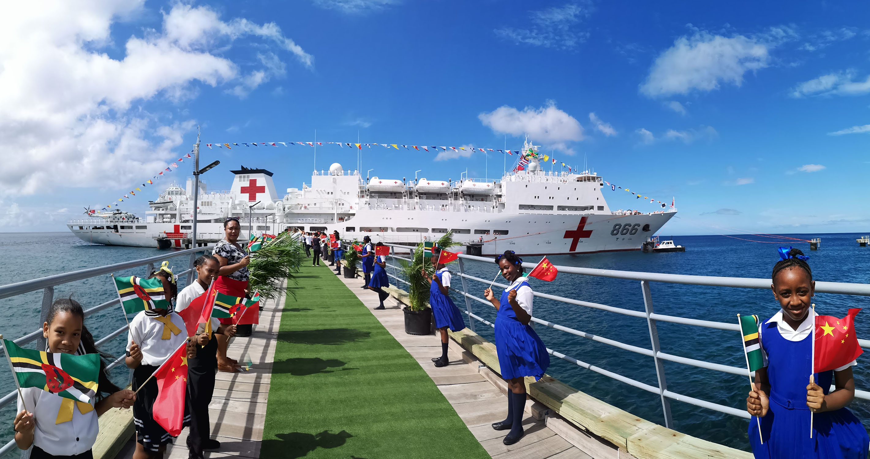 Local students wave flags to greet the arrival of the PLA Navy hospital ship Peace Ark in Roseau, Commonwealth of Dominica, Oct. 12, 2018. (Photo by Jiang Shan/Xinhua)