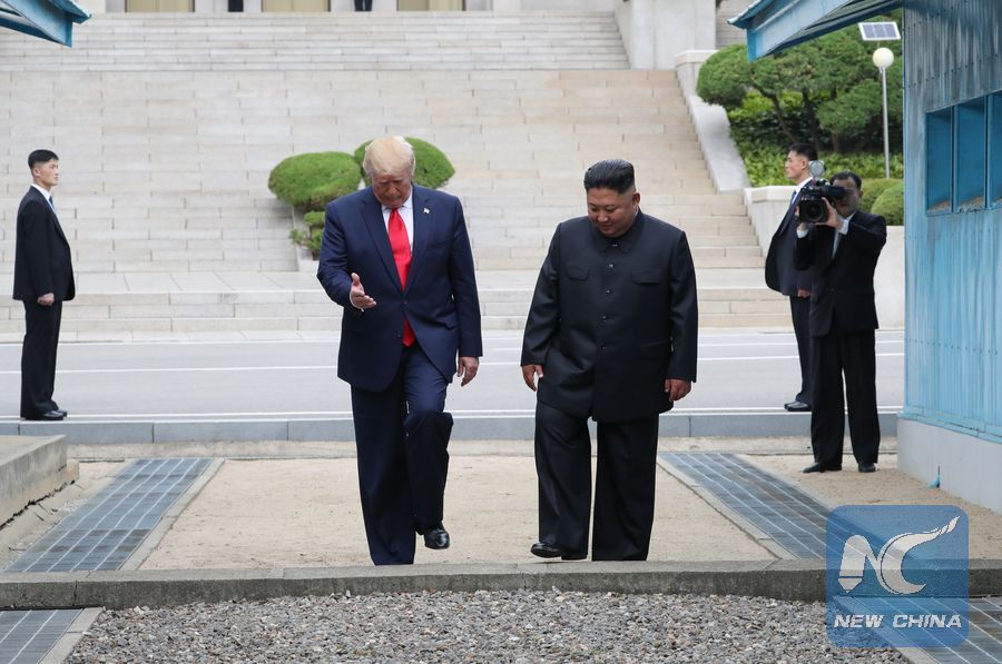 U.S. President Donald Trump meets with Kim Jong Un, top leader of the Democratic People's Republic of Korea (DPRK), in the inter-Korean border village of Panmunjom on June 30, 2019. (Xinhua/NEWSIS)