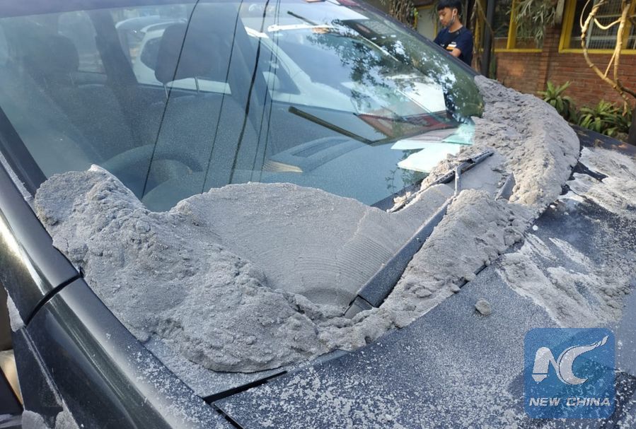 Thick ash spewed from Mount Tangkuban Parahu is seen on a car after the eruption in West Java, Indonesia, July 26, 2019. (Xinhua/HO-BNPB)