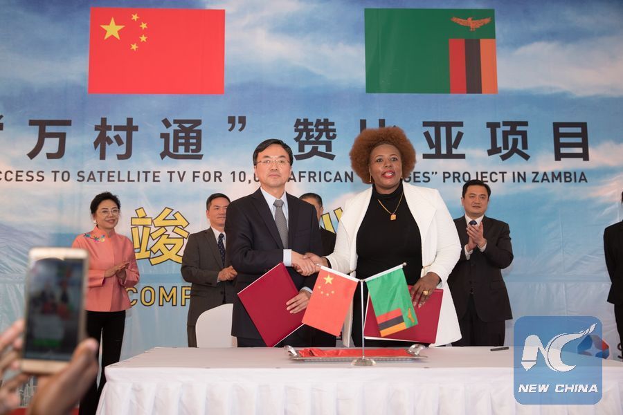 File photo shows Dora Siliya (R, Front), Zambia's Minister of Information and Broadcasting Services, and Zhang Maoyu (L, Front), Vice Chairman of ChinaInternational Development Cooperation Agency, pose for a photo after signing the handover documents during the completion ceremony of aChina-funded village TV project in Chongwe, Lusaka Province, Zambia, on June 13, 2019. China handed over to the Zambian side on Thursday a completed project providing hundreds of local villages access to satellite TV. The project, which was officially launched in June last year by President Edgar Lungu, saw the installation of satellite television sets in 500 villages in the country's 10 provinces. (Xinhua/Peng Lijun)