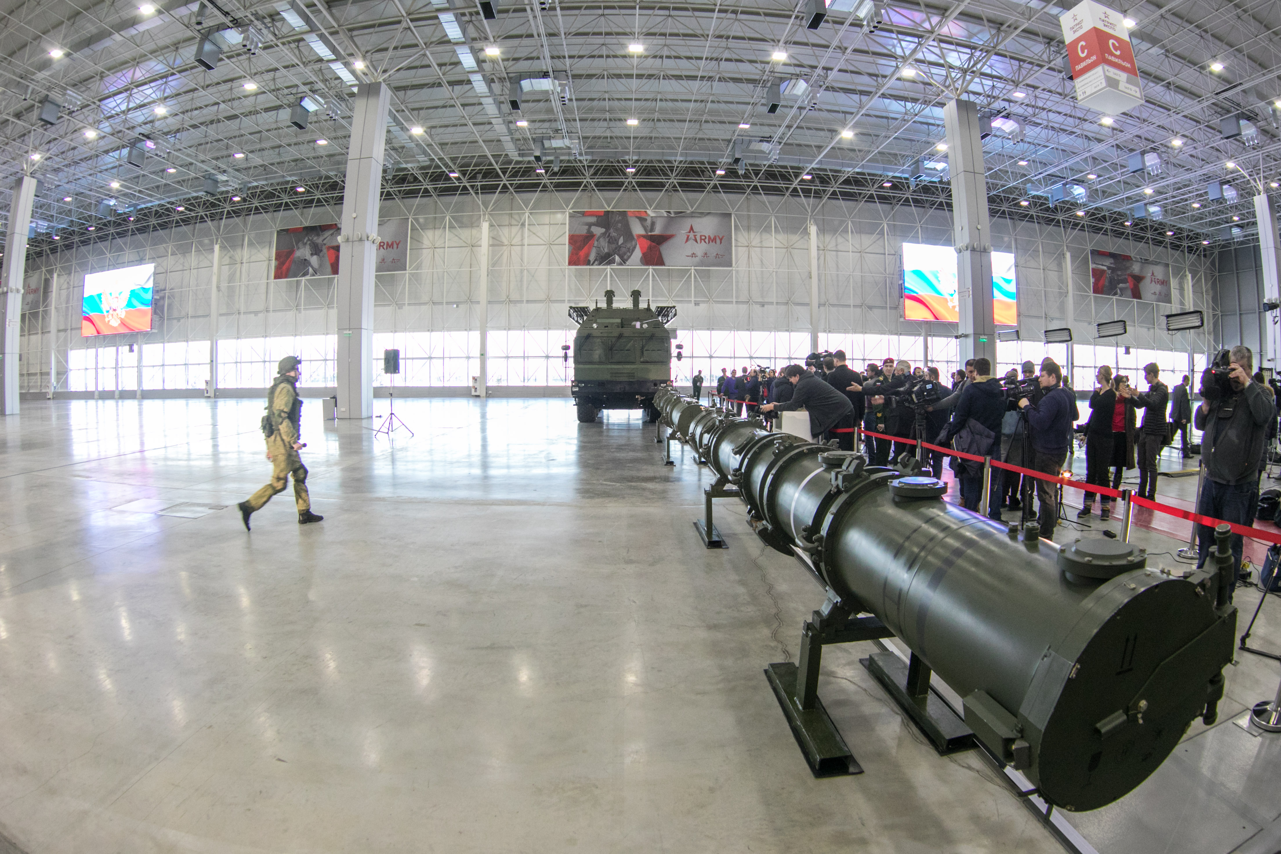 The 9M728 missile container (front) and the 9M729 (back) missile container are demonstrated at the Patriot Congress and Exhibition Center, outside Moscow, Russia, on Jan. 23, 2019. Senior Russian officials said the Russian 9M729 land-based cruise missile, contrary to the allegations of the United States, does not fall under the INF Treaty. (Xinhua/Bai Xueqi)
