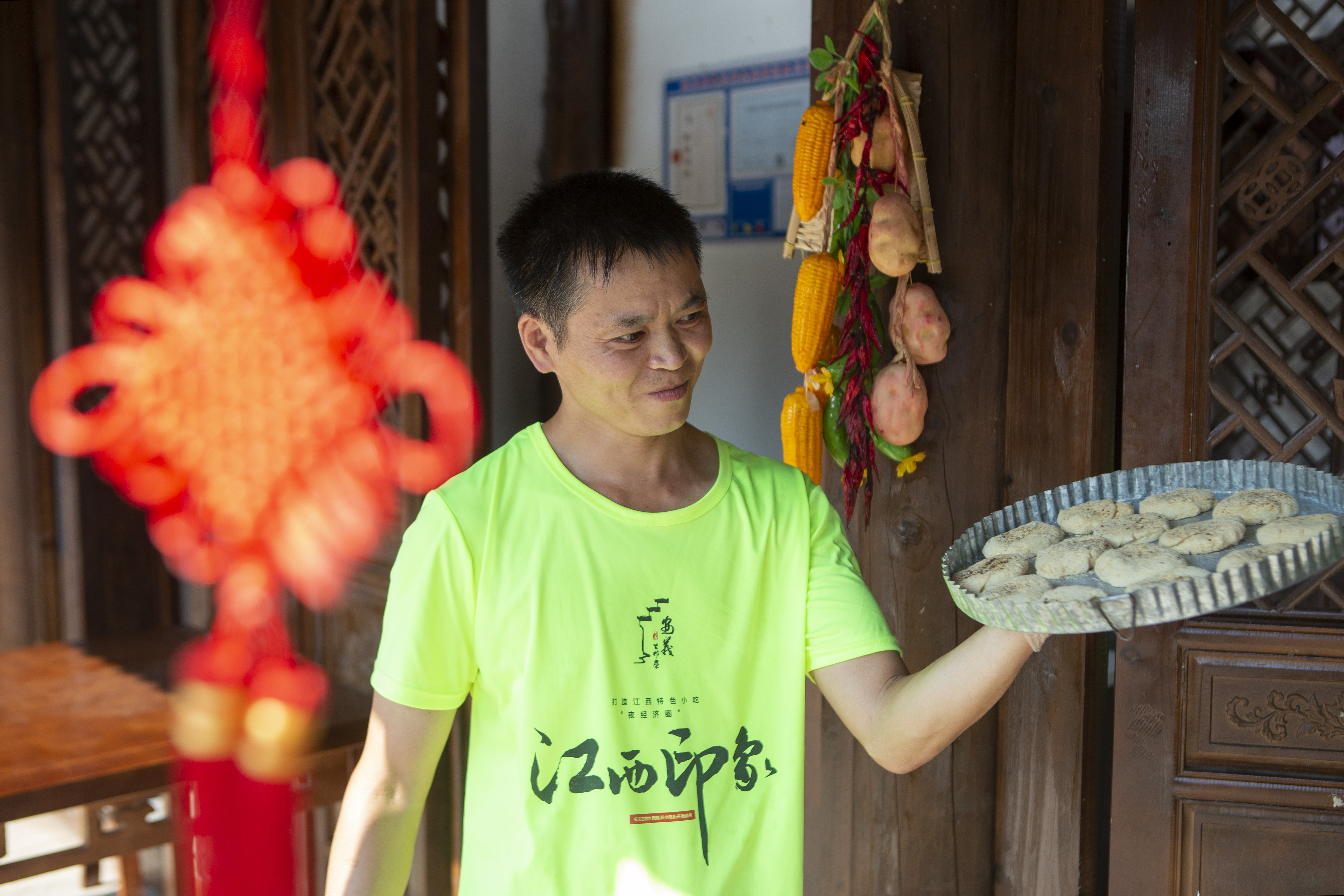 A staff member shows the freshly made ciba, a traditional cuisine of steamed glutinous rice pounded into paste, at the Jiangxi style snack street in Shuinan Village, Anyi County, east China's Jiangxi Province, Aug. 8, 2019. (Xinhua/Meng Chenguang)