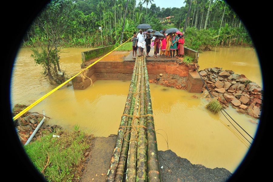 People cross a flooded area through makeshift bamboo bridge in Wayanad of Kerala, India, Aug. 11, 2019. (Str/Xinhua)