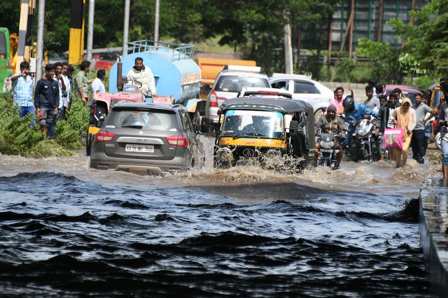 Vehicles move through a flooded road in Mandya district, Karnataka state, India, Aug. 11, 2019. (Photo by Kashif Masood/Xinhua)