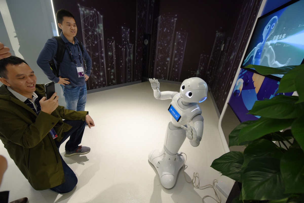 A visitor interacts with an AI robot with 5G technology during China International Big Data Industry Expo 2019 in Guiyang, southwest China's Guizhou Province, May 26, 2019. (Xinhua/Yang Wenbin)