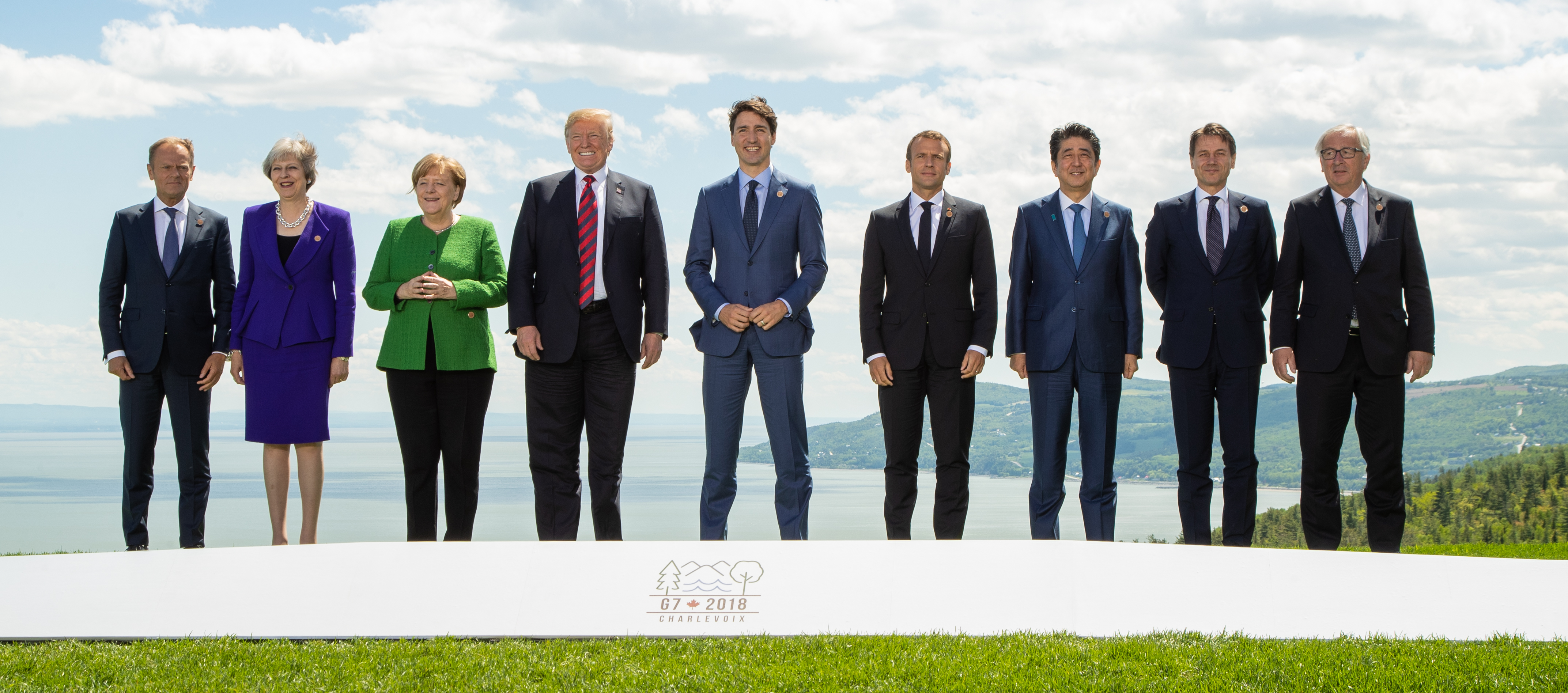 Participants of the Group of Seven (G7) summit European Union Council President Donald Tusk, British Prime Minister Theresa May, German Chancellor Angela Merkel, U.S. President Donald Trump, Canadian Prime Minister Justin Trudeau, French President Emmanuel Macron, Japanese Prime Minister Shinzo Abe, Italian Prime Minister Giuseppe Conte and European Commission President Jean-Claude Juncker (from L to R) pose for a group photo on the first day of the G7 summit in La Malbaie, Quebec, Canada, June 8, 2018. (Xinhua/POOL)