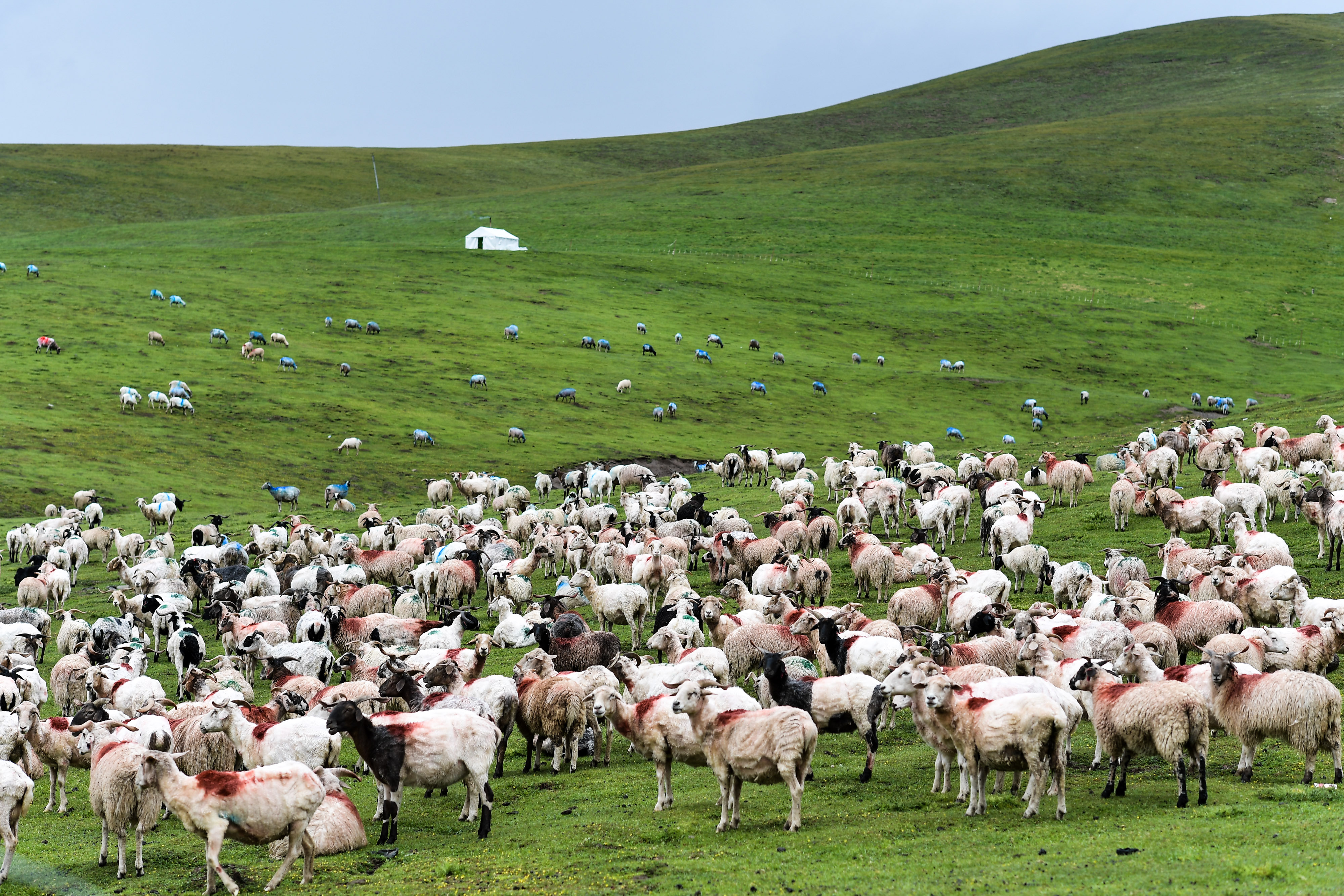 A flock of goats in a pasture at the foot of Qilian Mountains in northwest China. (Xinhua/Wu Gang)