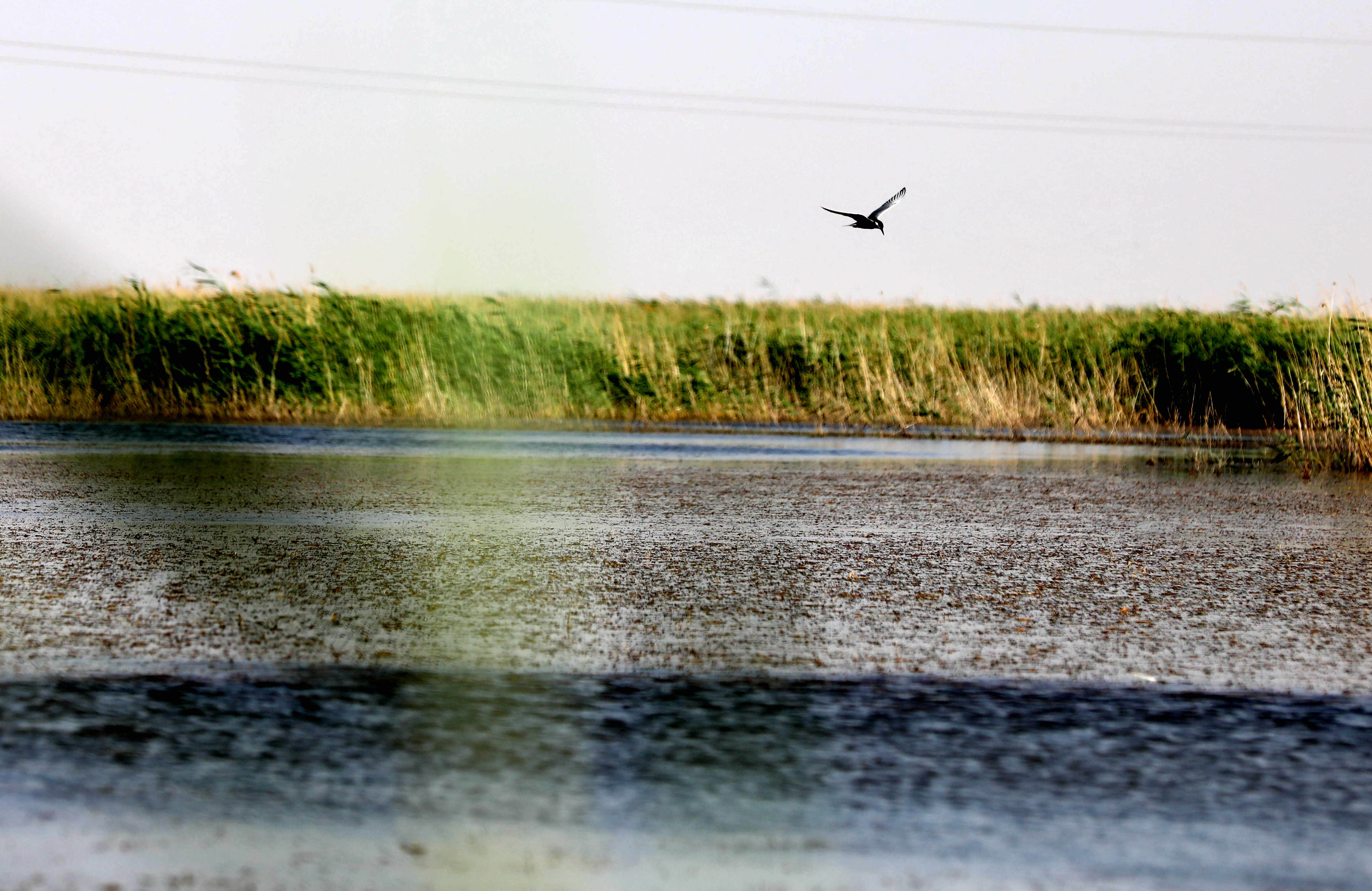A migratory bird flies over the Qingtu Lake in Minqin County of Wuwei City, northwest China's Gansu Province. (Xinhua/Guo Gang)