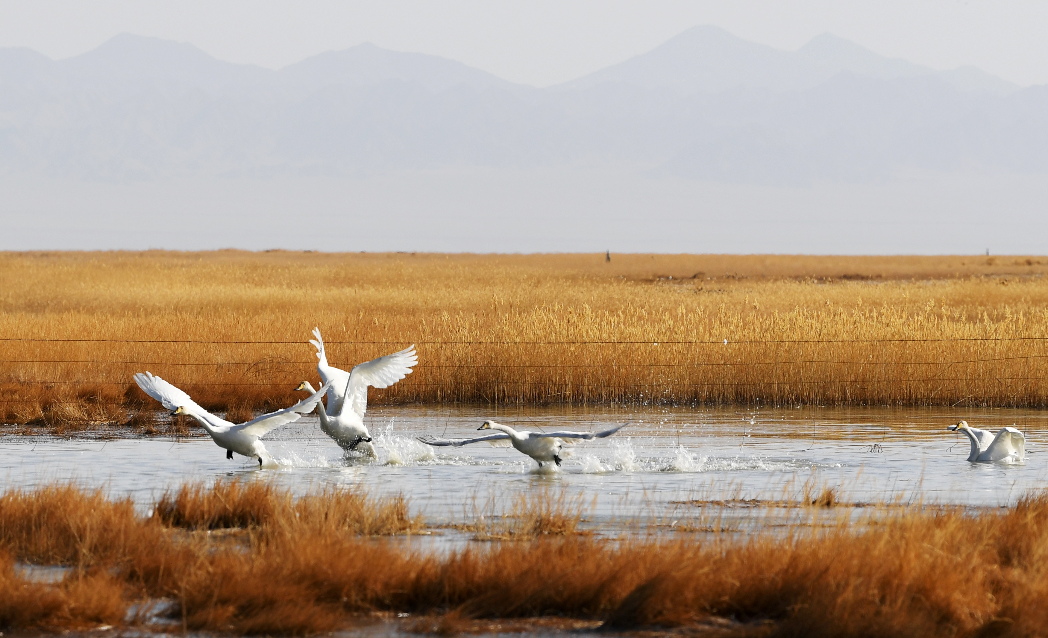 White swans fly on the Xiaosugan lake wetland in Kazak Autonomous County of Aksay, northwest China's Gansu Province. (Xinhua/Chen Bin)