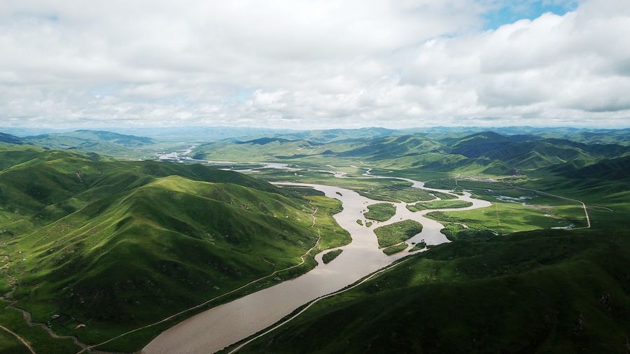 Aerial photo taken on June 23, 2019 shows the scenery of wetland and grasslands in Maqu County of Gannan Tibetan Autonomous Prefecture, northwest China's Gansu Province. (Xinhua/Chen Bin)