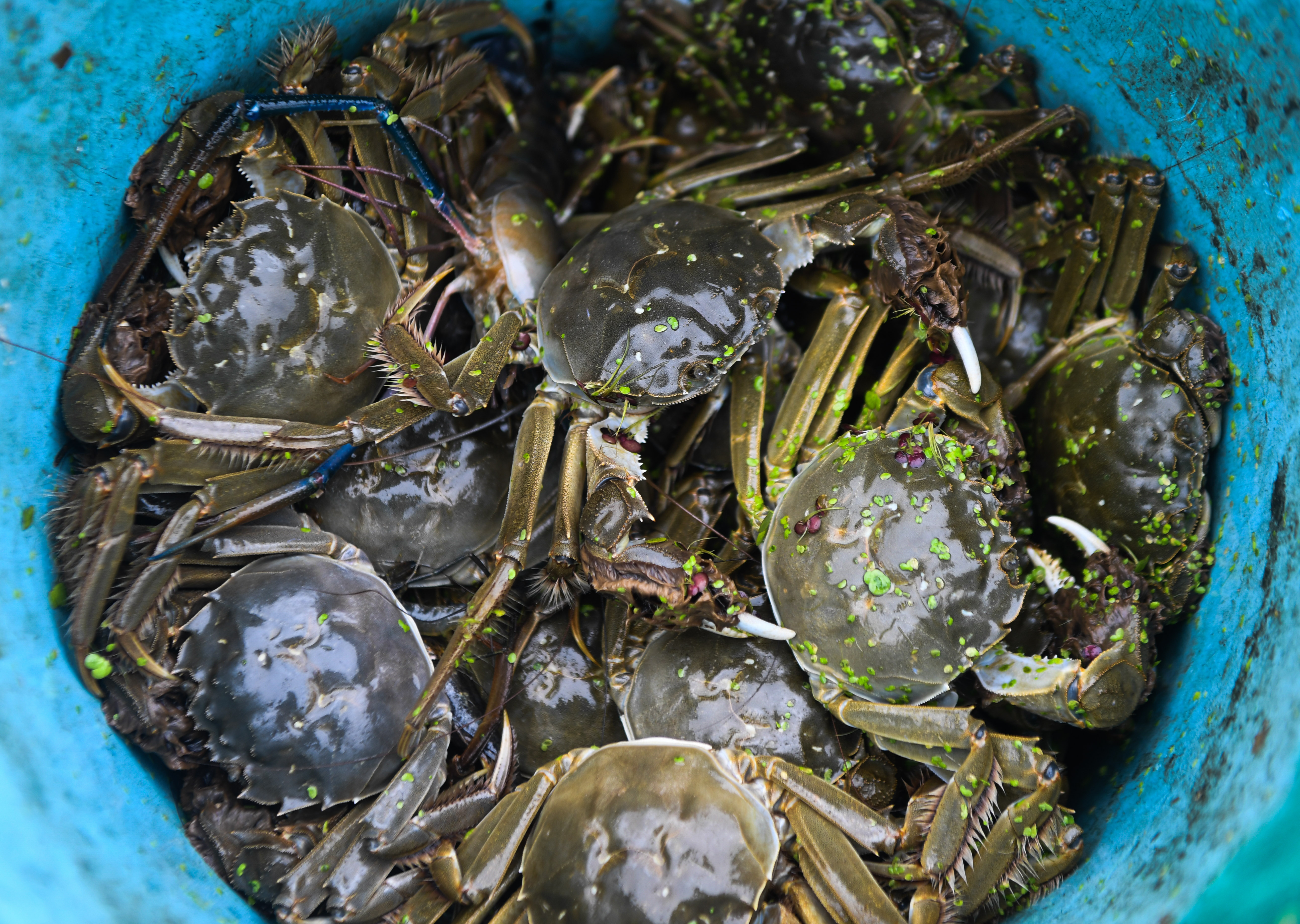 Photo taken on Sept. 4, 2019 shows newly-caught crabs at an aquaculture cooperative in Zhili Township of Huzhou, east China's Zhejiang Province.(Xinhua/Xu Yu)